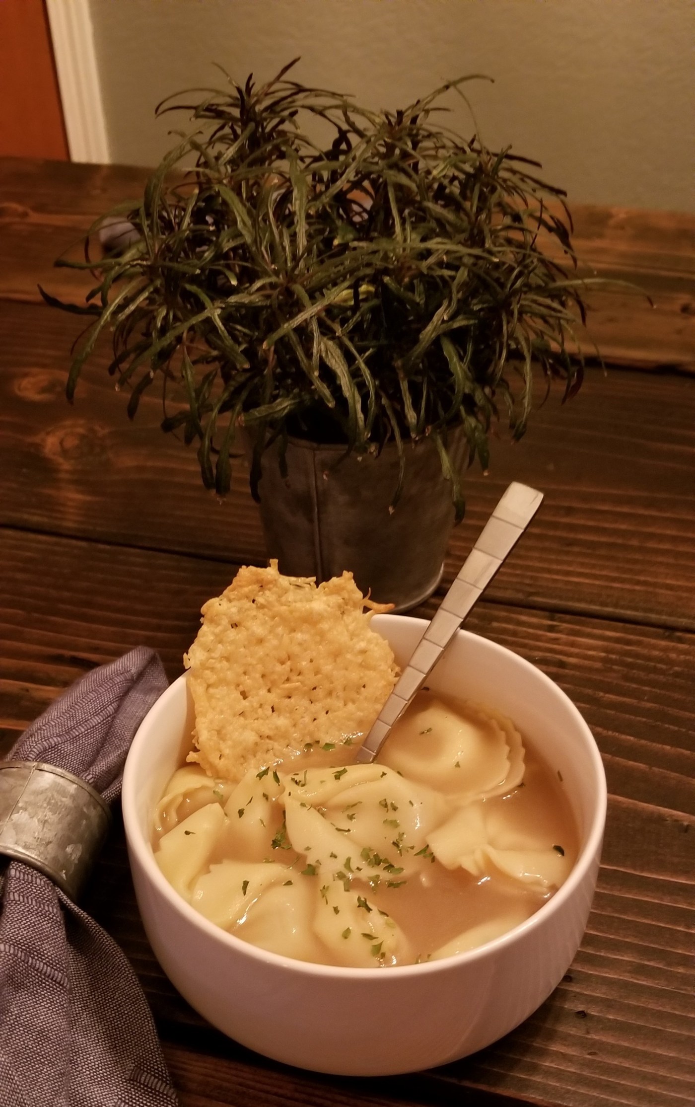 Ladle the broth and tortellini into soup bowls. Top with parsley and Parmesan Crisps and serve.