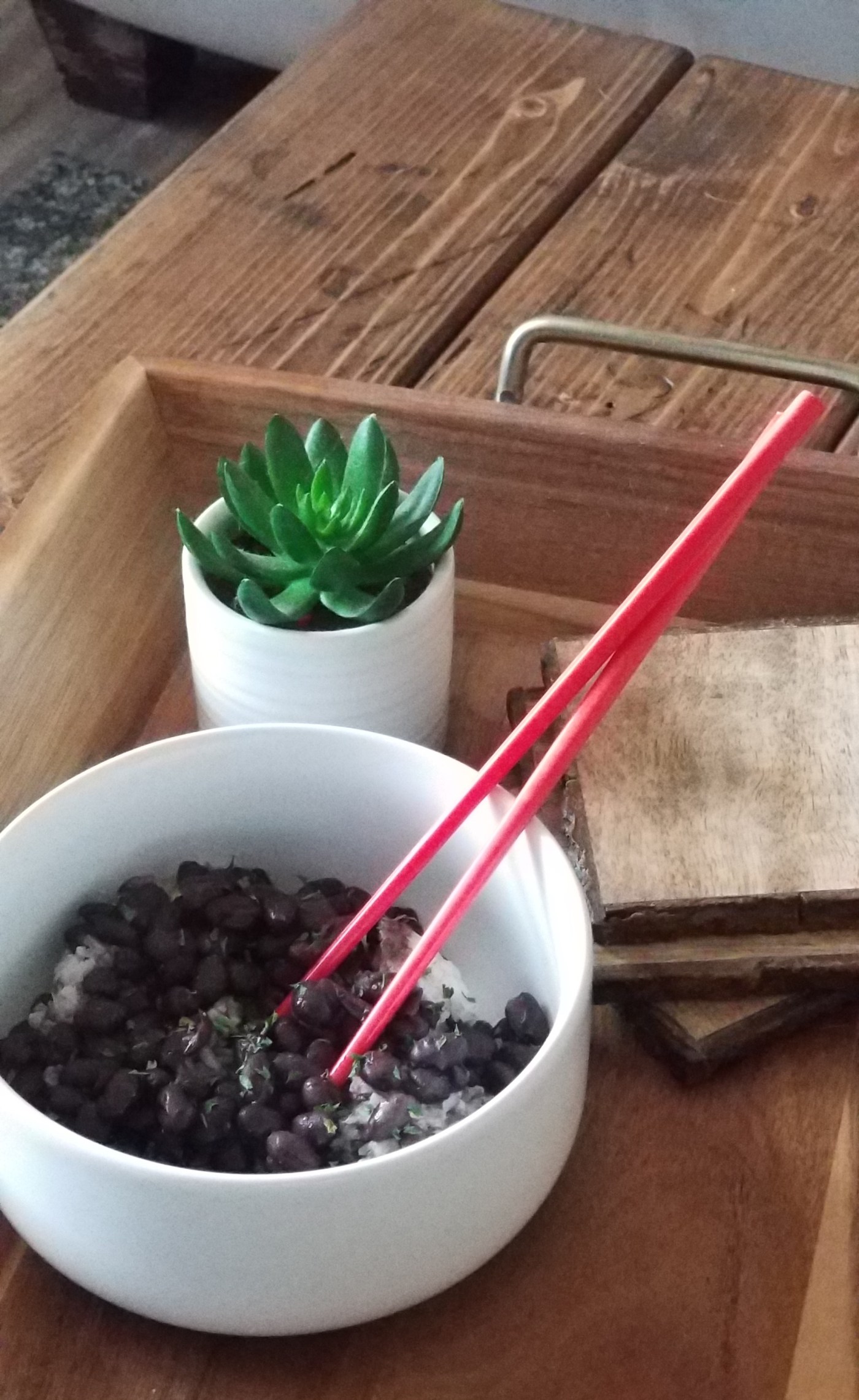 - When rice is complete put it in the base of a bowl, pour 1/2 cup of Black Beans over the rice!