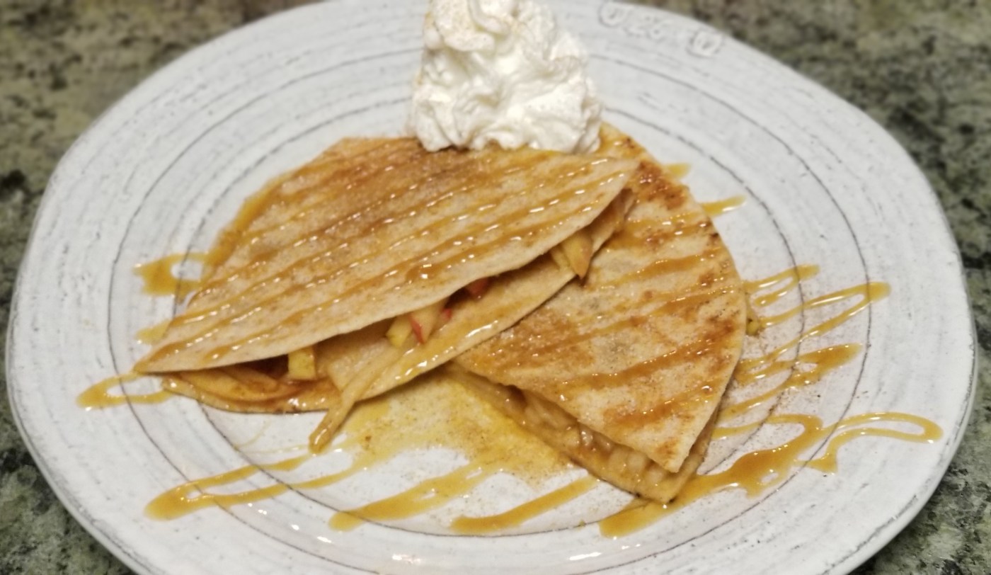 Cut the quesadillas into 4 wedges and arrange on plates. Sprinkle with more cinnamon and sugar, drizzle with caramel and top with whip cream!