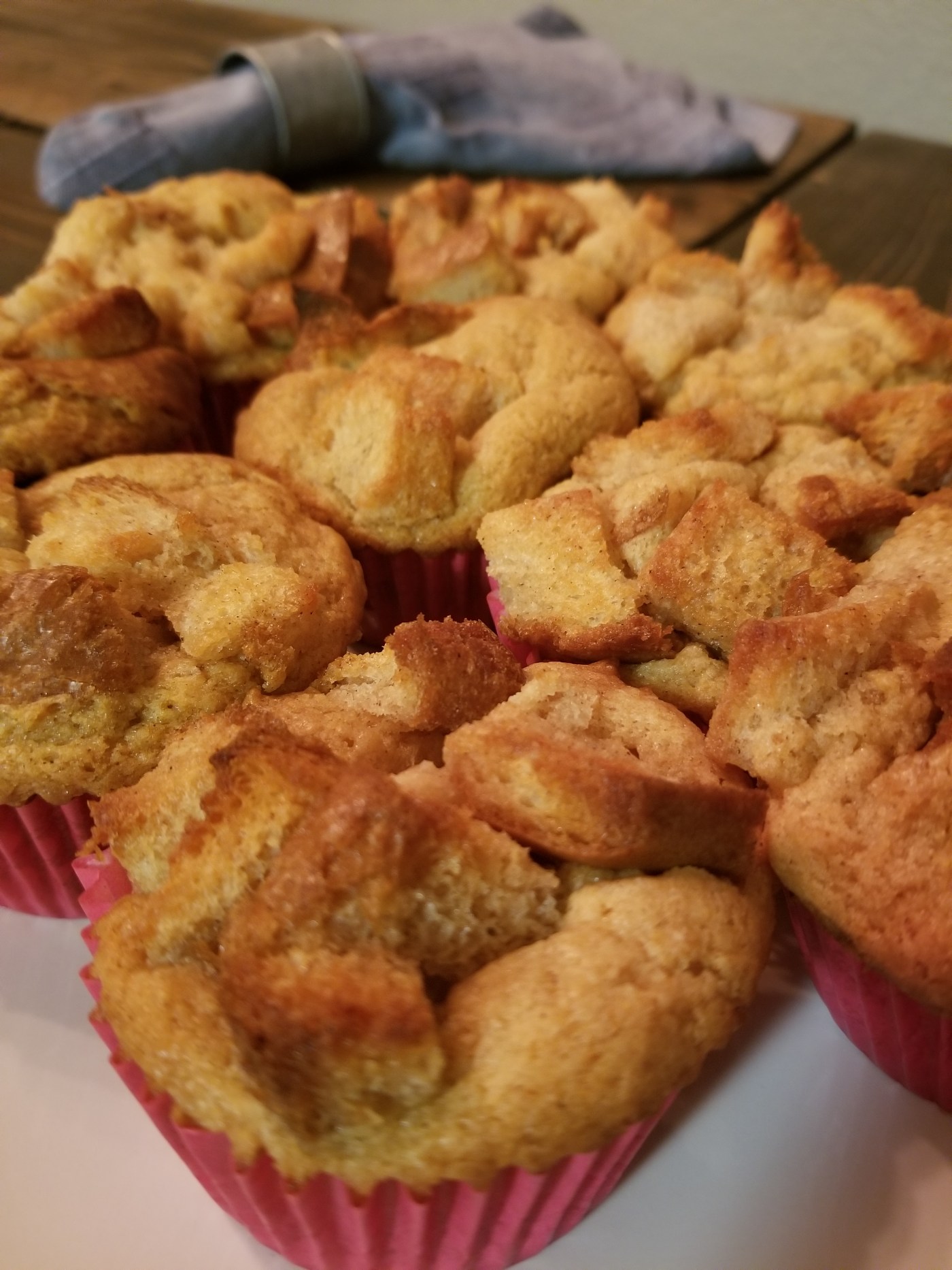 Spoon batter into 12 muffin pan cups sprayed with cooking spray. Top with bread mixture; press lightly into batter with back of spoon.
