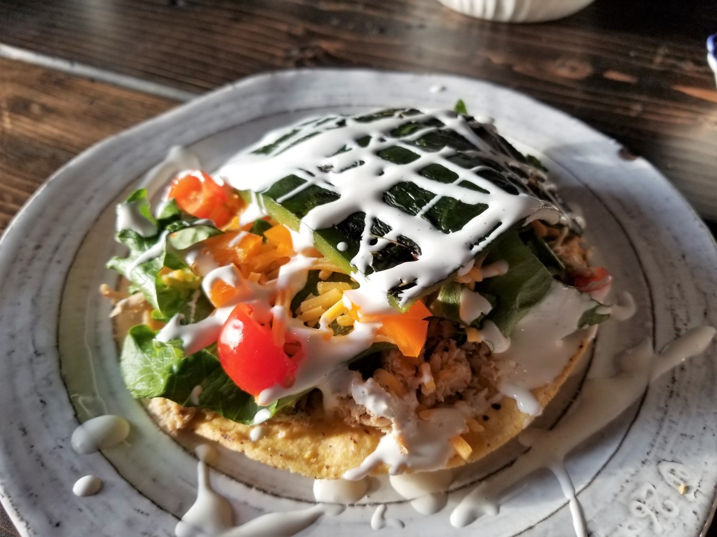 Laydown your tostada shell. Top with the shredded chicken, Poblano pepper, and remaining toppings that you love! Drizzle with Mexican crema and eat!