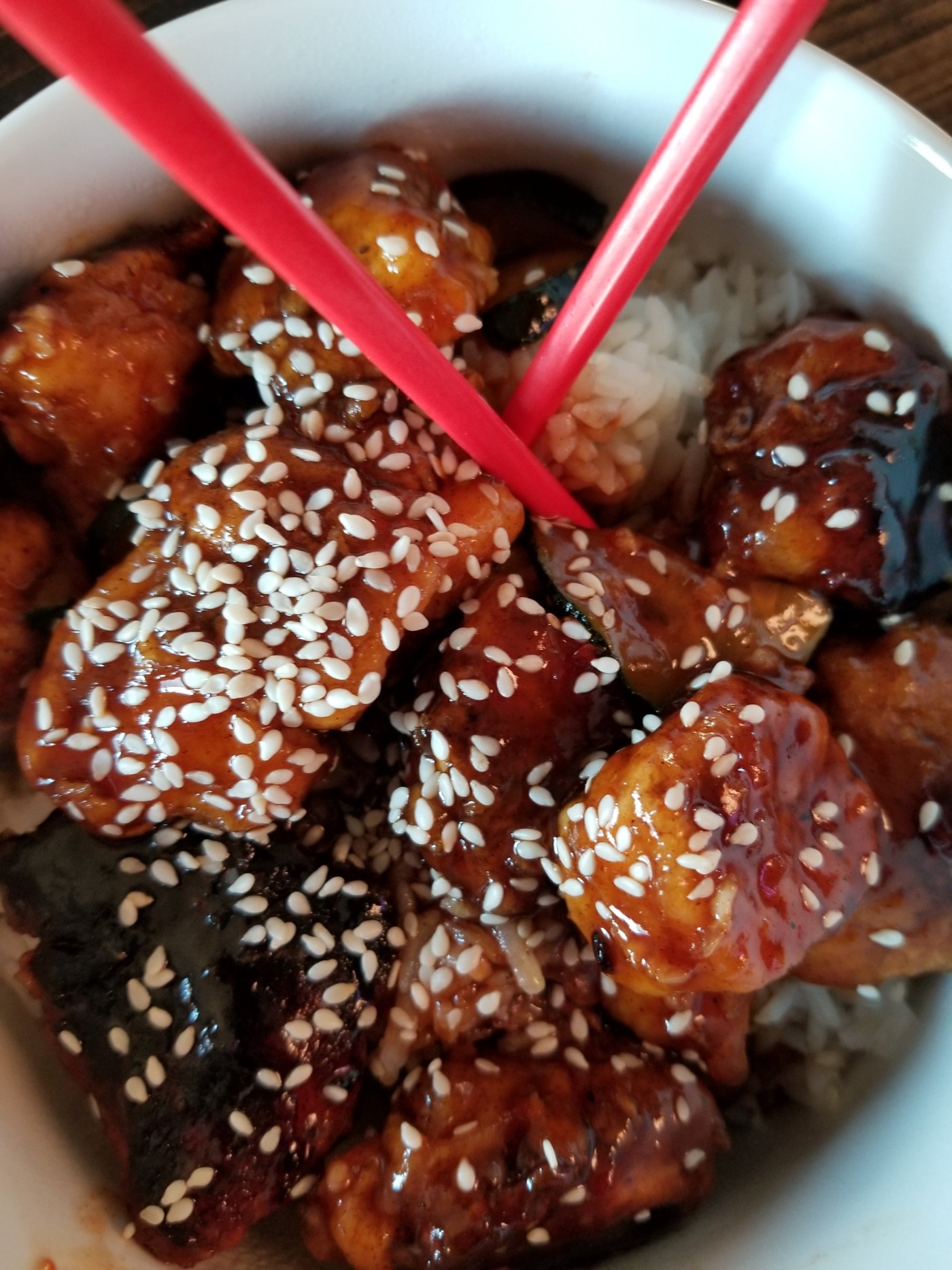 Dredge the chicken in the cornflour, then dip in the egg (make sure all of the chicken is covered in egg wash), and finally dredge it in the seasoned flour. Add to the wok and cook on a high heat for 6-7 minutes, turning two or three times during cooking, until well browned. You may need to cook in two batches (I find I can do it in one batch so long as it’s no more than 3 chicken breasts). Remove from the pan and place in a bowl lined with kitchen towels.