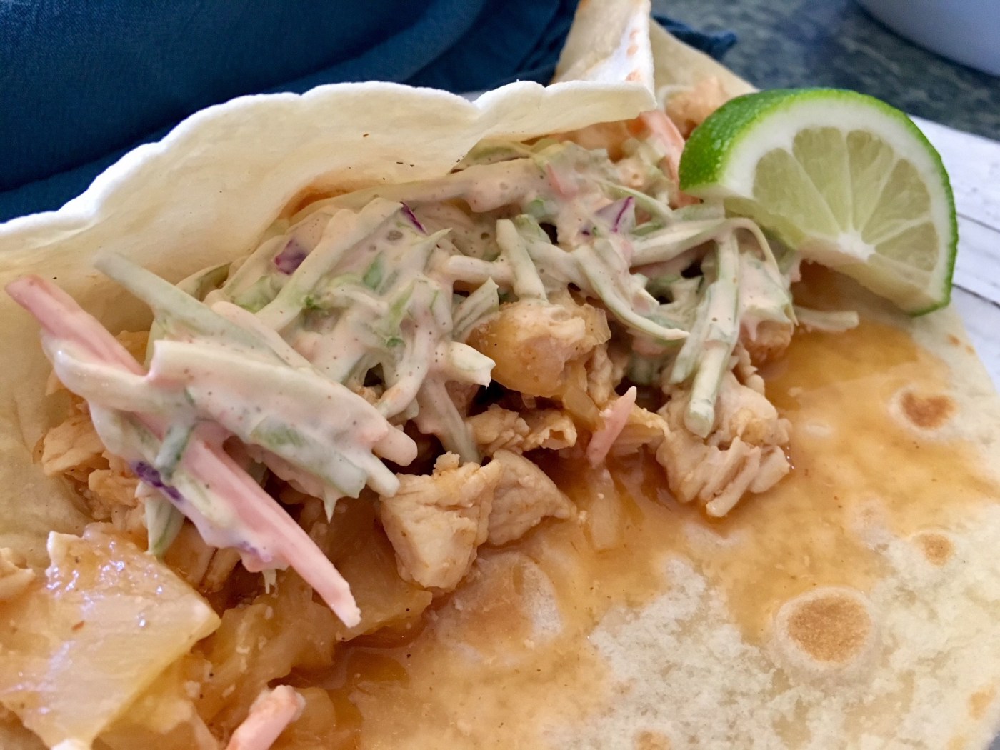 To build the tacos, place the tortillas flat on a plate, add the sliced chicken down the middle and spoon on some of the reduced sauce from the skillet. Top with the pineapple, slaw and cilantro. Serve alongside chips and salsa.