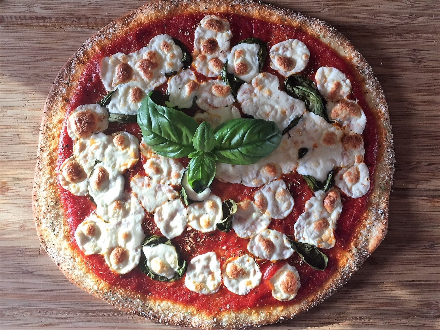 Place fresh Basil leaves all over the pizza. Add as much fresh mozzarella balls as you would like on your pizza.