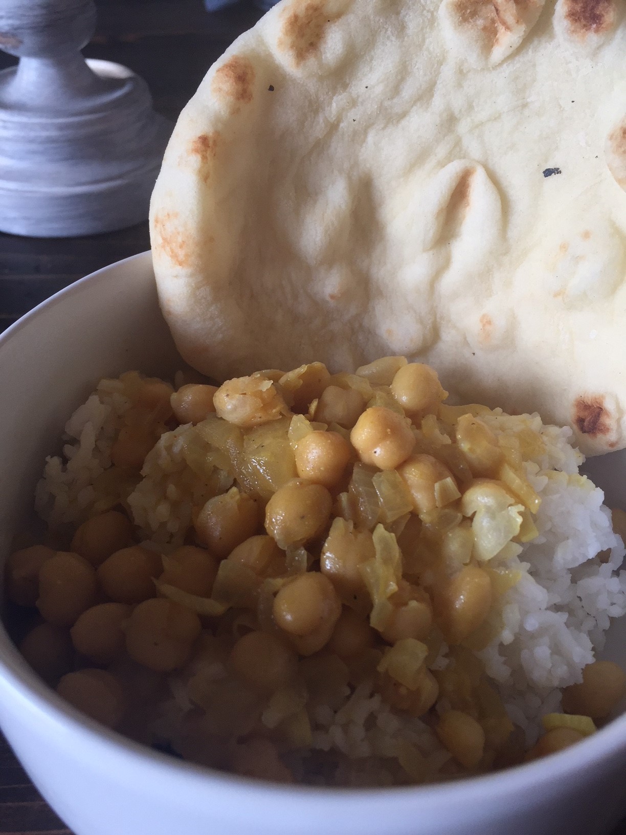 Warm the naan in the microwave. Serve the curry over the rice with the warmed naan. Garnish with the cilantro.