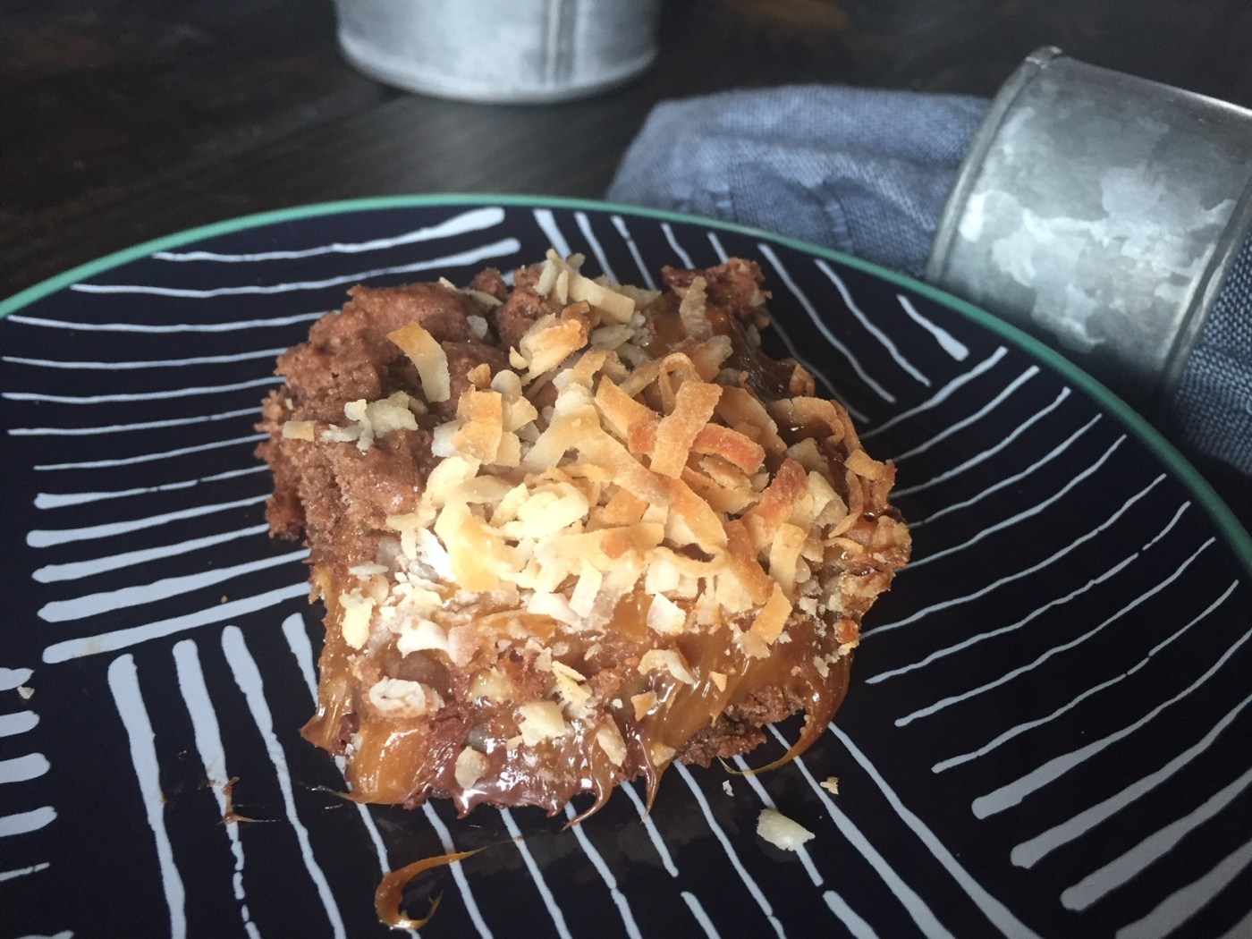 Put half of cake mixture in a greased & floured 9×13 pan. Bake 6 minutes at 350 degrees. Sprinkle chocolate chips over cake mixture (DO NOT MIX INTO CAKE BATTER). Pour caramel mixture over chocolate chips. Sprinkle toasted coconut and chopped walnuts. Pour remaining cake mix on top, dropping mix by spoonfuls.