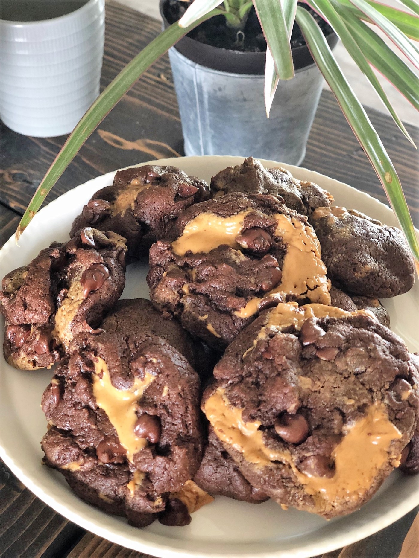 Smush a frozen ball of nut butter into the center of each cookie (see video), then re-roll. If desired, press some chocolate chips into the tops. Bake 10 minutes – they should look underdone when you take them out of the oven.