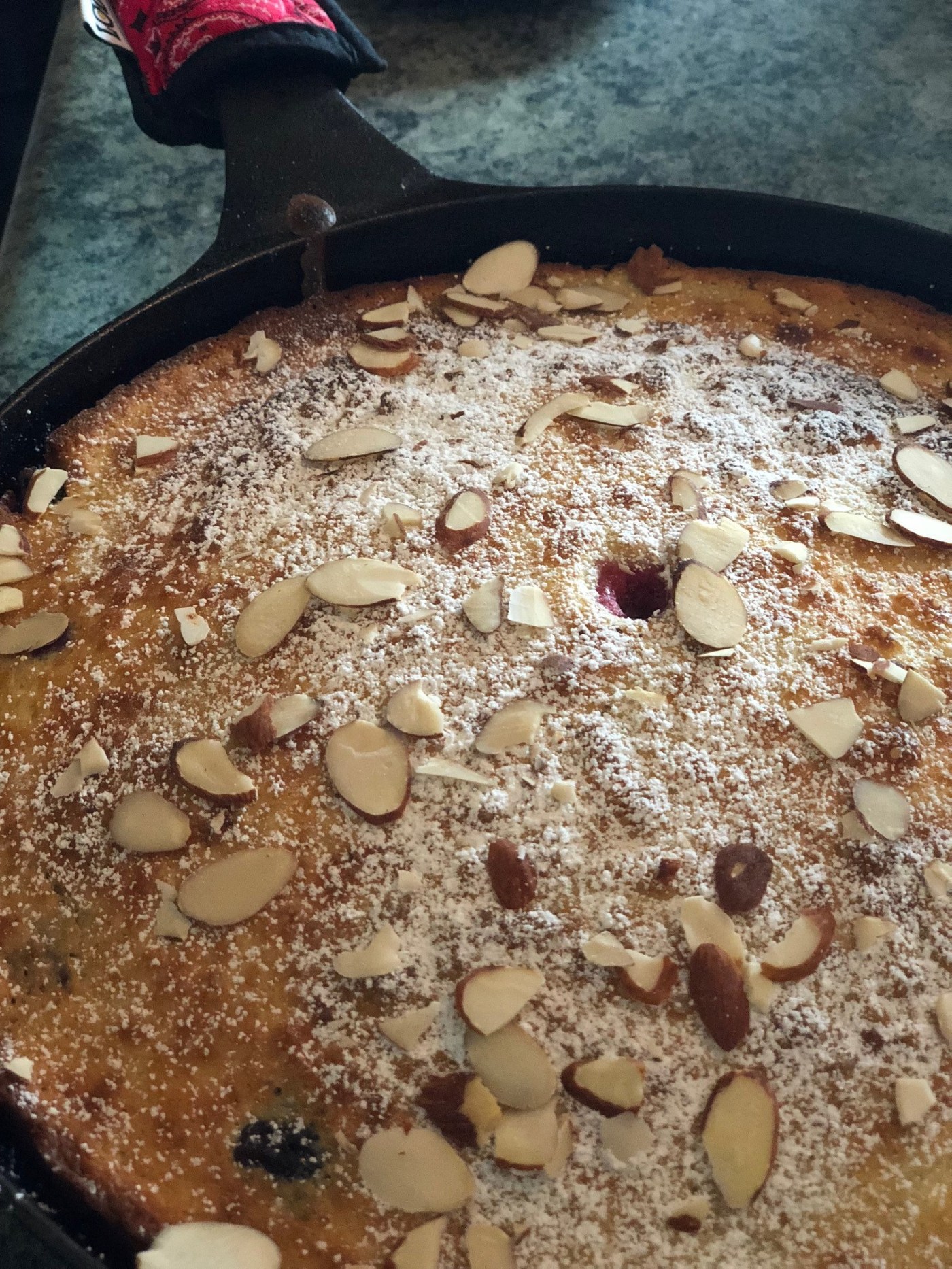 Top with the almonds and a dusting of powdered sugar. Serve warm with a scoop of ice cream or syrup!