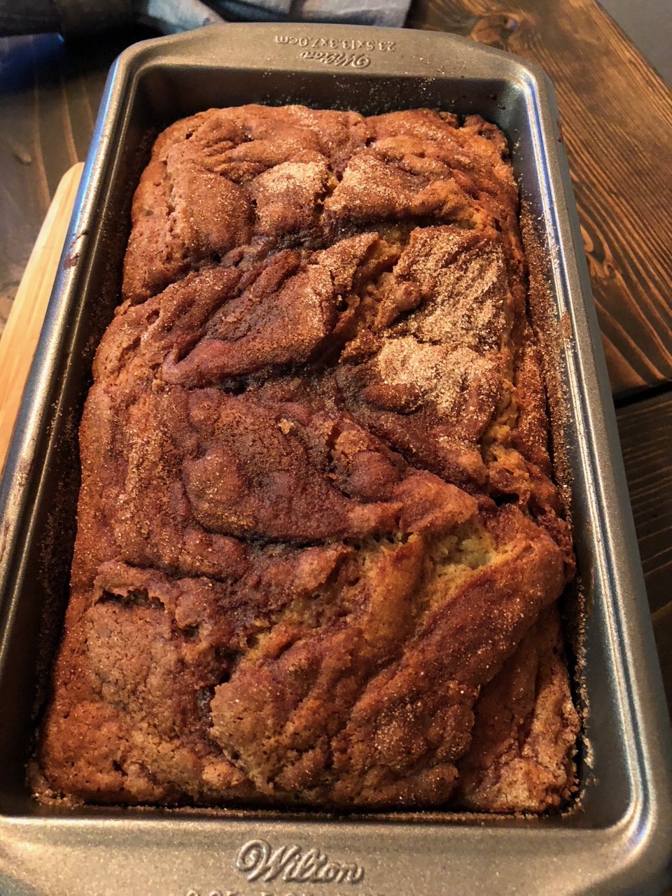 For one layer of the cinnamon sugar – pour about half of the banana bread into the loaf pan and sprinkle the cinnamon sugar mixture on top, then pour the remaining batter on top.