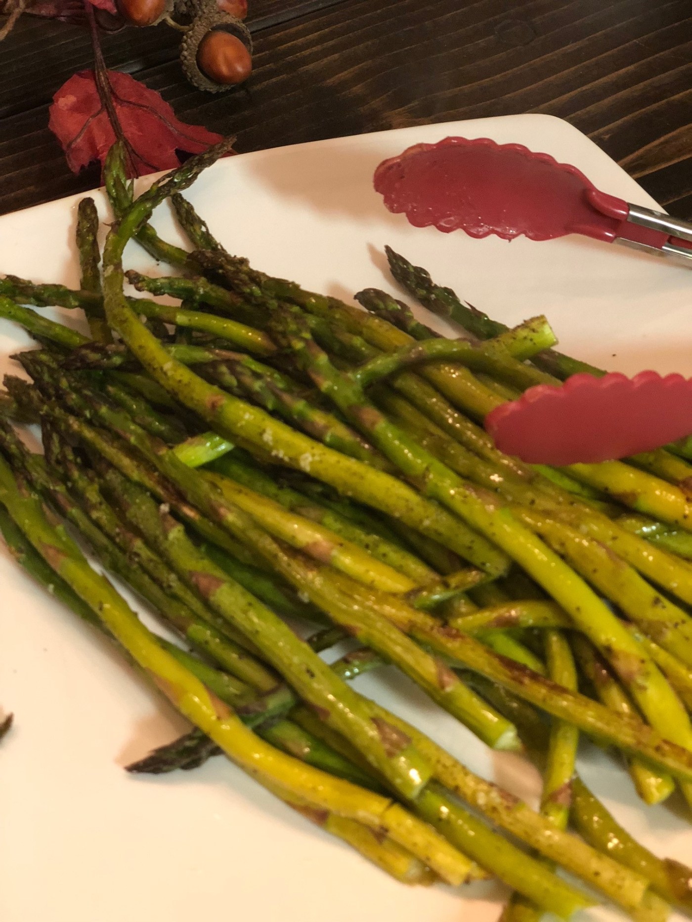 In a gallon bag put your cleaned asparagus in. Drizzle with the olive oil, minced garlic, kosher salt and black pepper.