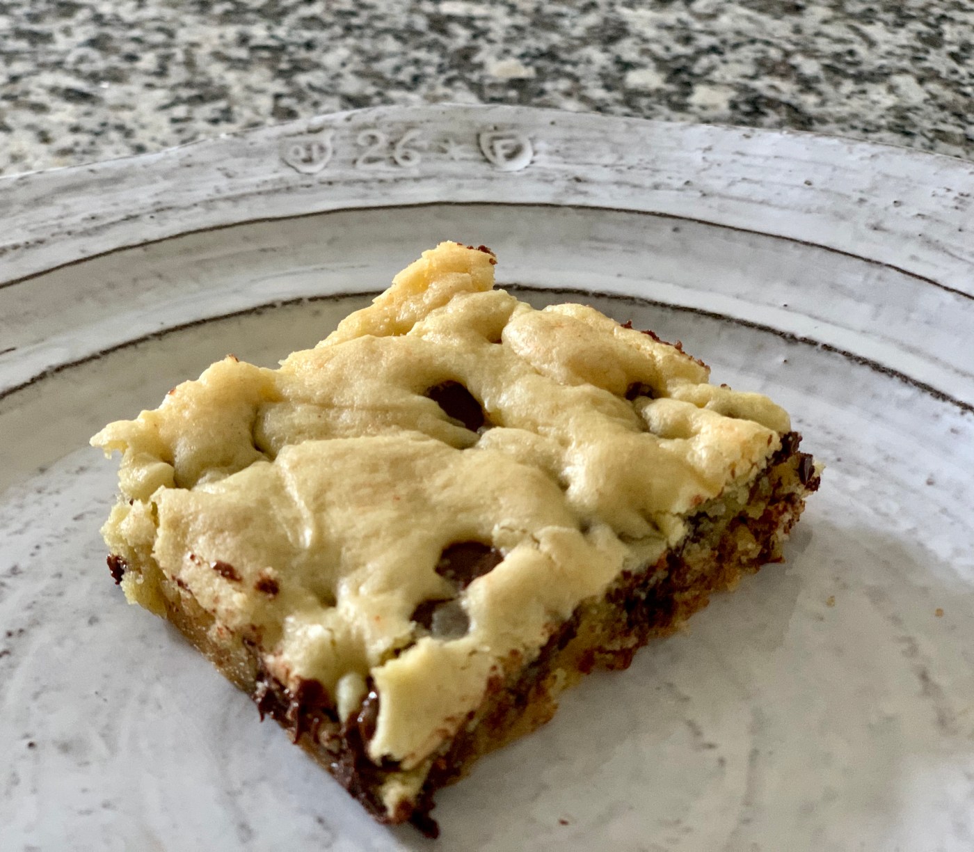 Melt the butter then whisk it with eggs until combined. Add in the cake mix and stir well. Add in the chocolate chips and mix all together.