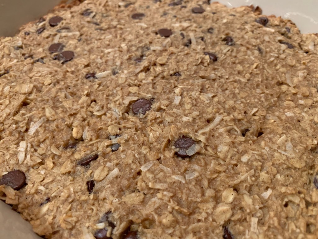Pour/spoon the mixture evenly into the prepared pan and bake for 25-28 minutes or until the center is set (it will still look relatively soft!).