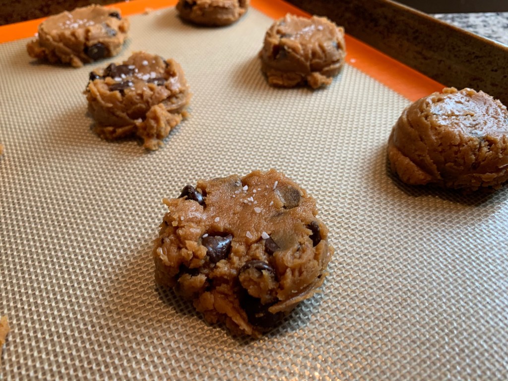 Using a medium cookie scoop, scoop and drop cookie dough balls onto the prepared baking sheet, spaced evenly apart. Using a spoon or bottom of a measuring cup, press down on cookie to flatten slightly. Cookies will spread a bit. Sprinkle with Kosher salt.