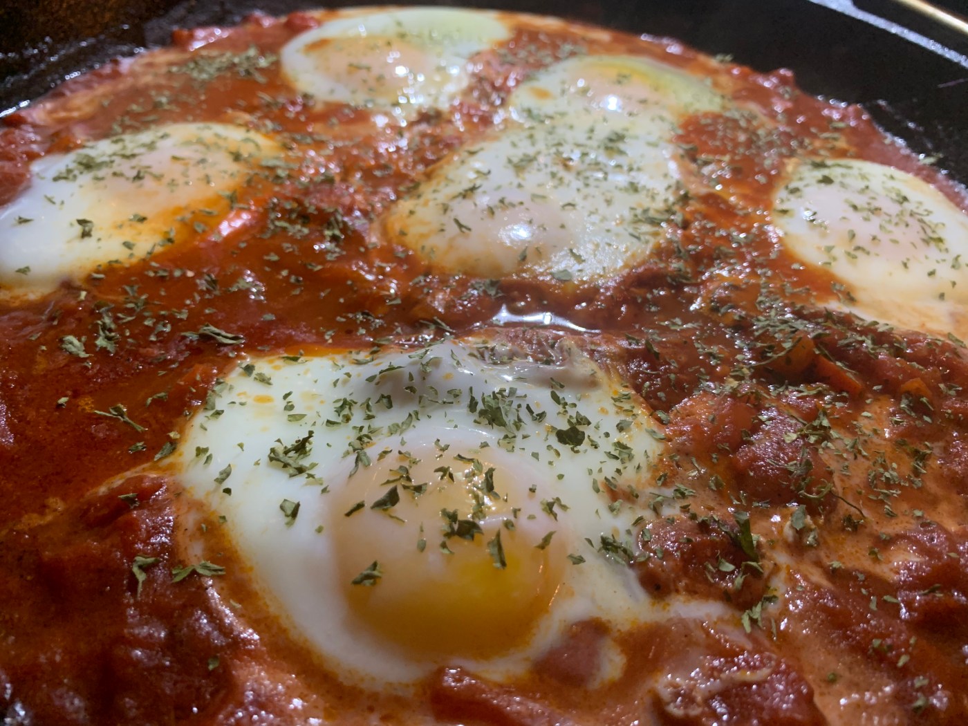 Eggs cooked on tomato sauce sautéing in black cast iron frying pan on stovetop.