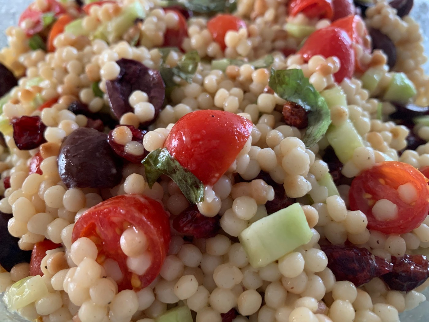 Dice up the cucumber, tomato, herbs, olives and craisins. Add them to the Couscous and mix well. Taste for seasoning and adjust with salt and/or pepper as needed. Enjoy warm or cover then refrigerate until cool, about 1 hour.