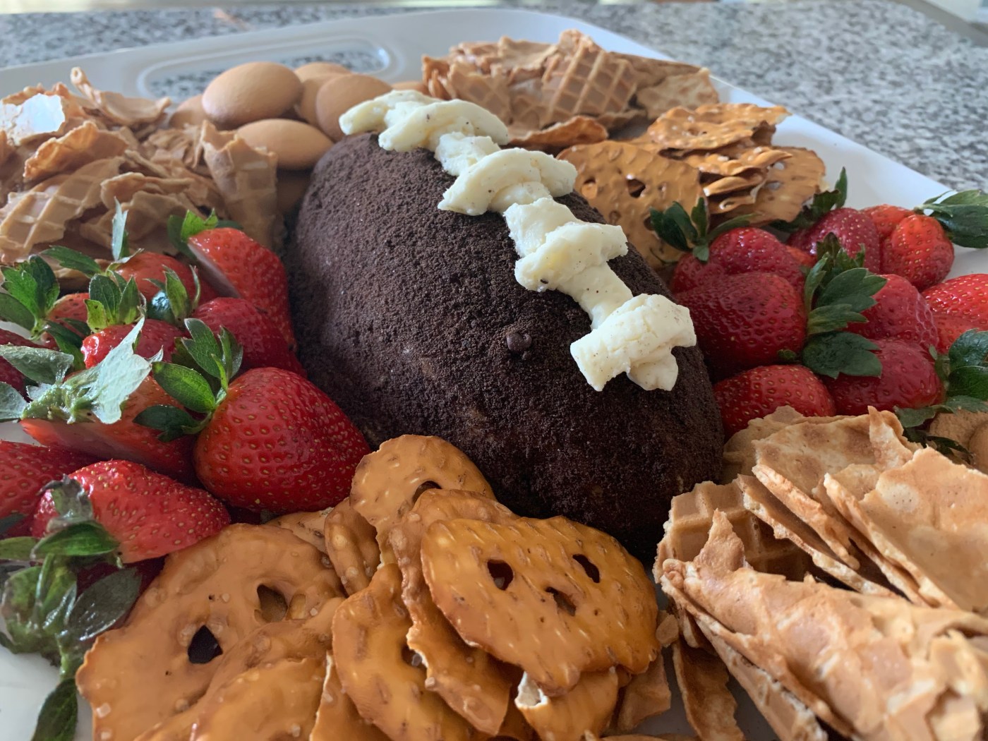 Use the mini chocolate chip and Oreo mixture to cover the rest of the dip, pressing gently to adhere and tilting the plate to fully cover the sides and ends of the football.