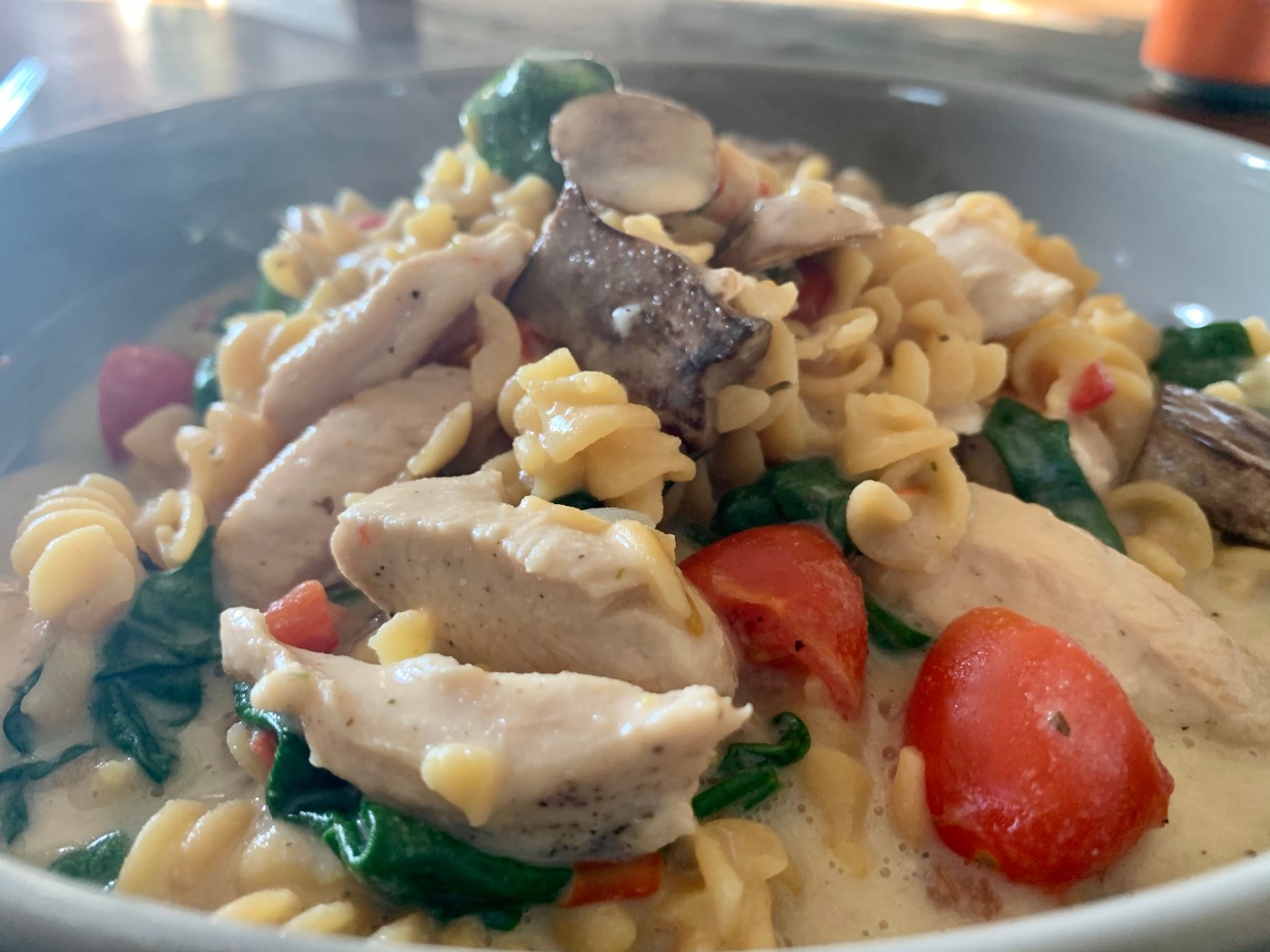 Tuscan Chicken Pasta with healthy creamy sauce, fresh vegetables, spinach and chicken. A great alternative to alfredo but just as good!