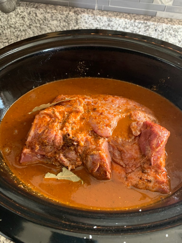 Season the pork all over with salt and pepper and transfer to a large slow cooker. Add the bay leaves and cinnamon stick, then pour in the sauce. Cover and cook on high until the meat is tender, about 5 hours.