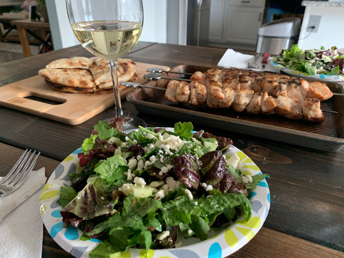 Toss together a simple Greek salad and top it with slices of grilled pita and a skewer of grilled chicken. Super Quick and Easy and perfect for a hot summer day!