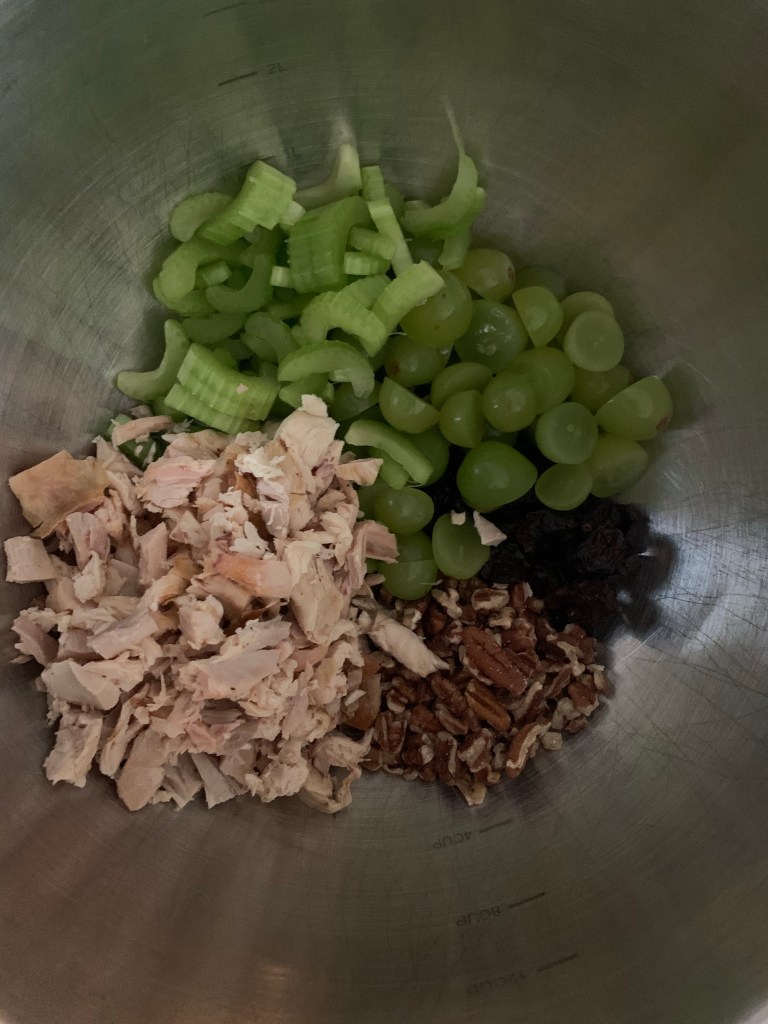 Add drained pasta to a salad bowl along with chicken, grapes, celery, pecans, and cranberries.