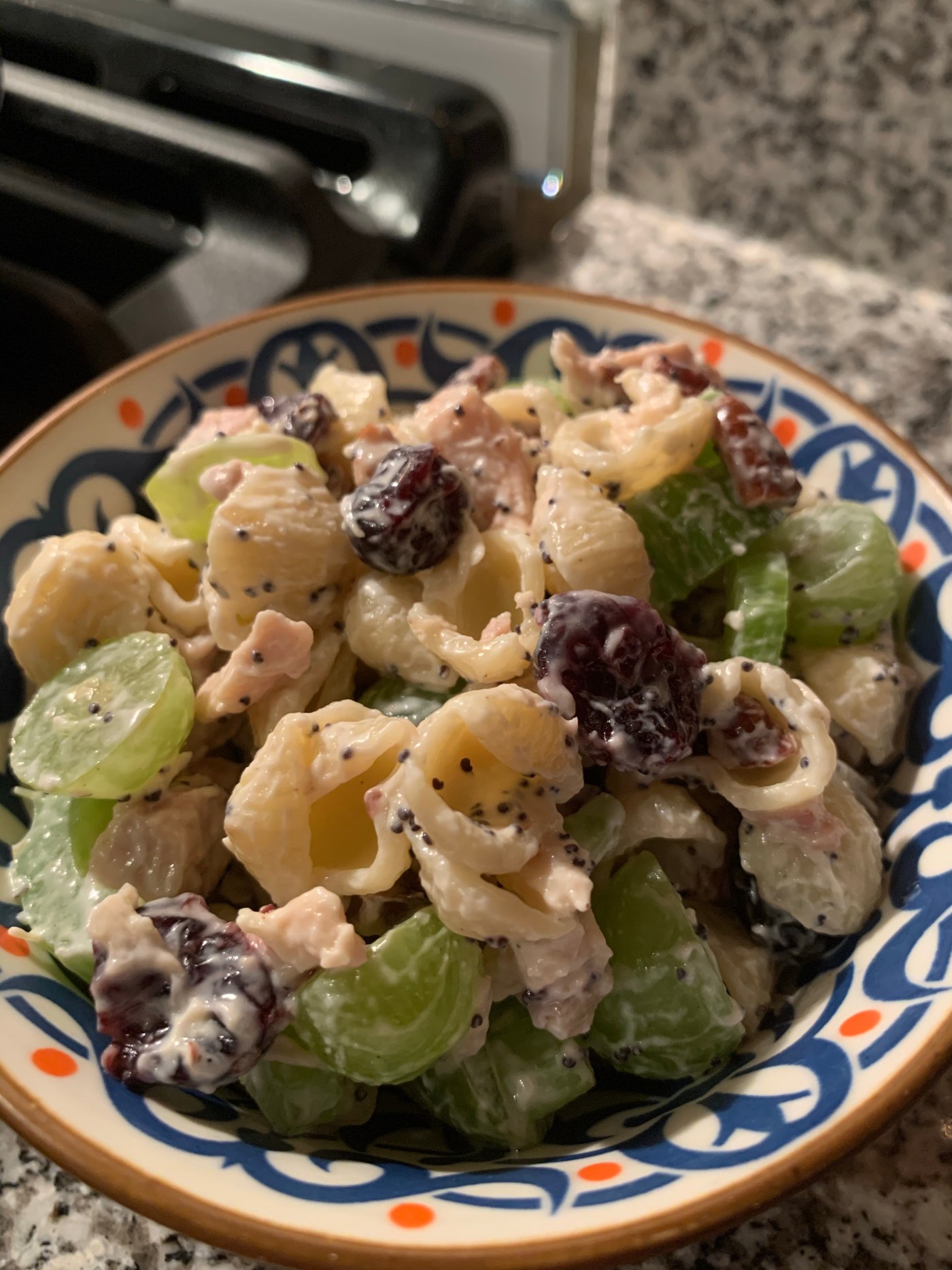 A fantastic pasta salad that has no limits. Everything in this recipe can be substituted for whatever you have laying around! Hearty pieces of chicken, sweet grapes, crisp celery and crunchy pecans tossed in a sweet poppy seed dressing! So yummy!