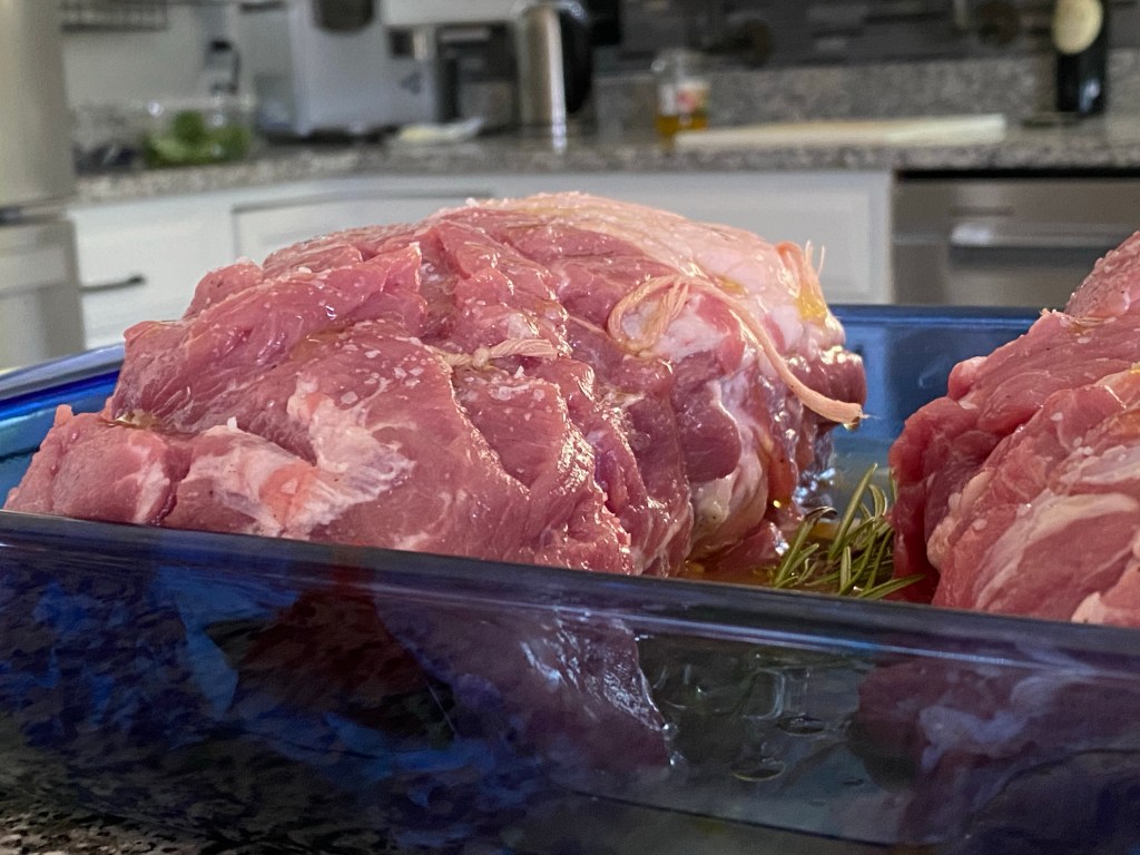 Set the pork on the bed of onions and scatter the rosemary sprigs around. Pour the broth into the bottom of the pan and drizzle the pork with the olive oil. Roast golden brown on top, about 50 minutes.