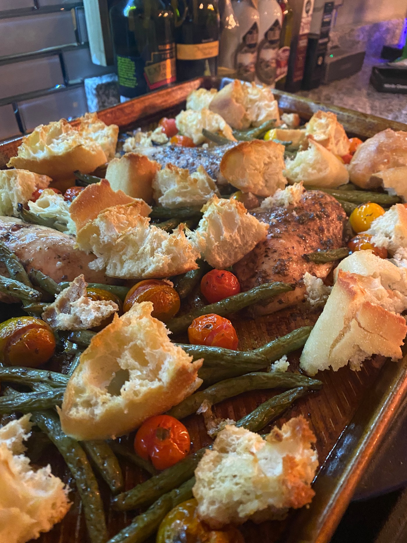 After the chicken and vegetables have roasted for 20 minutes, shake the pan to prevent sticking, then add the bread chunks to the pan. Continue to roast until the chicken is cooked through and the skin is golden and crisp, about another 10 minutes.