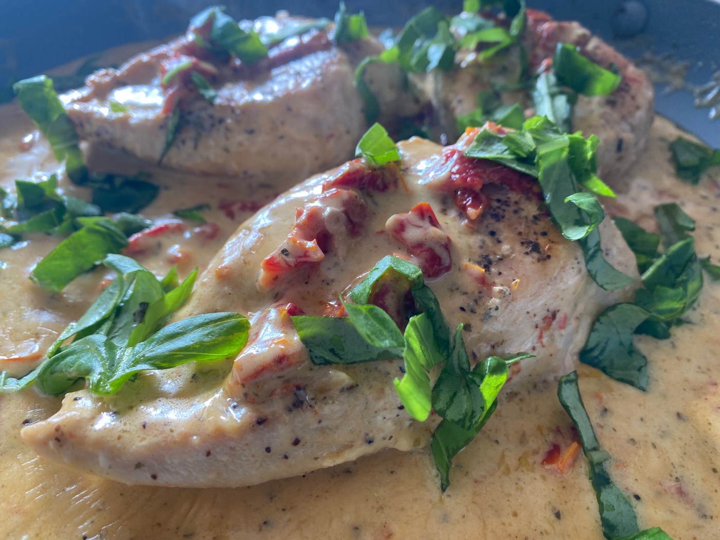 Add the garlic to the same skillet and cook until fragrant about 1 minute. Stir in heavy cream, chicken stock, bouillon, ¼ cup parmesan cheese, sun dried tomatoes, Italian seasoning, 1/4 teaspoon crushed red pepper flakes and remaining 1/2 teaspoon salt, stirring until fully combined.